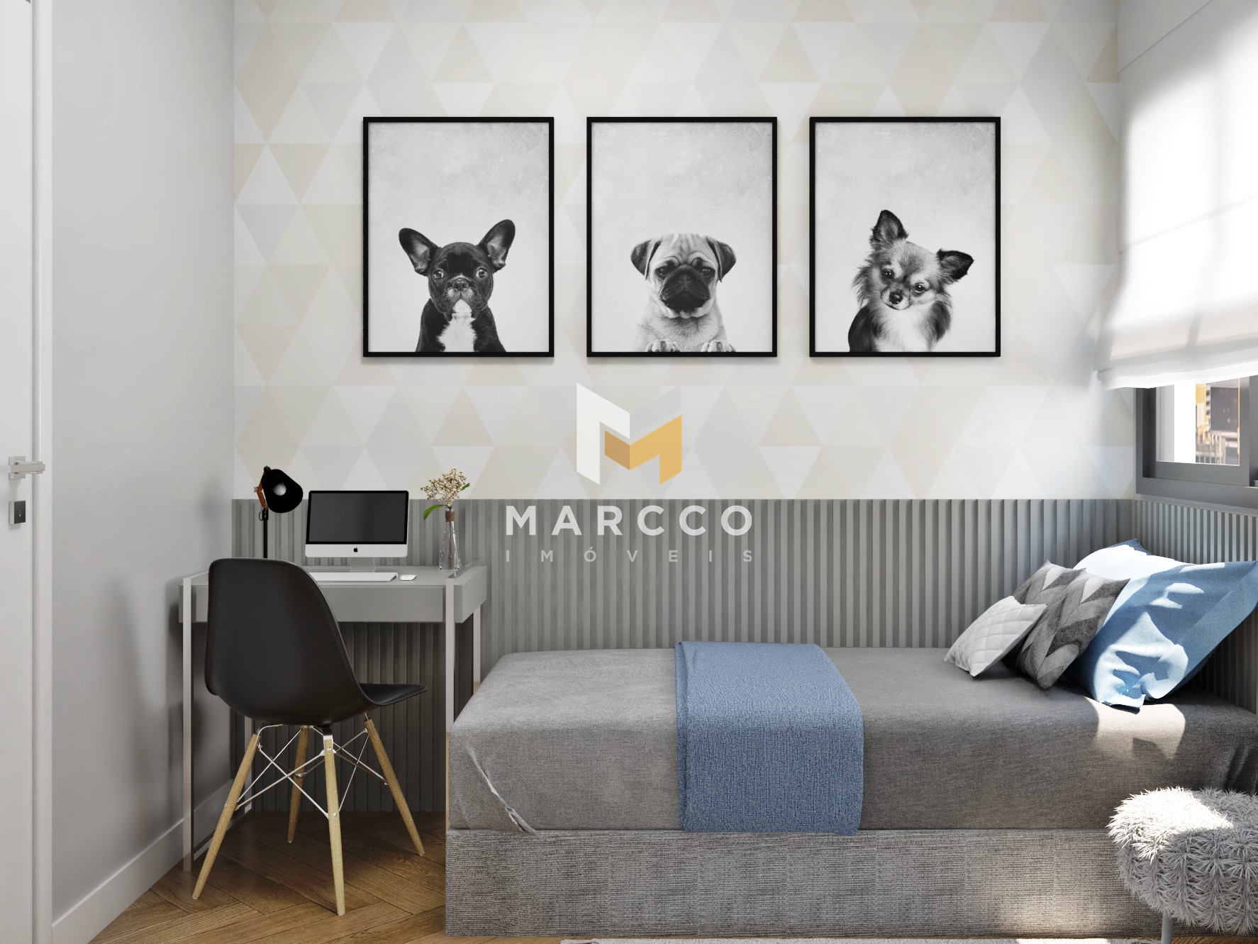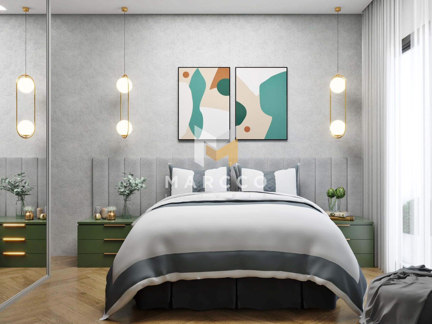 Piso laminado nos quartos;