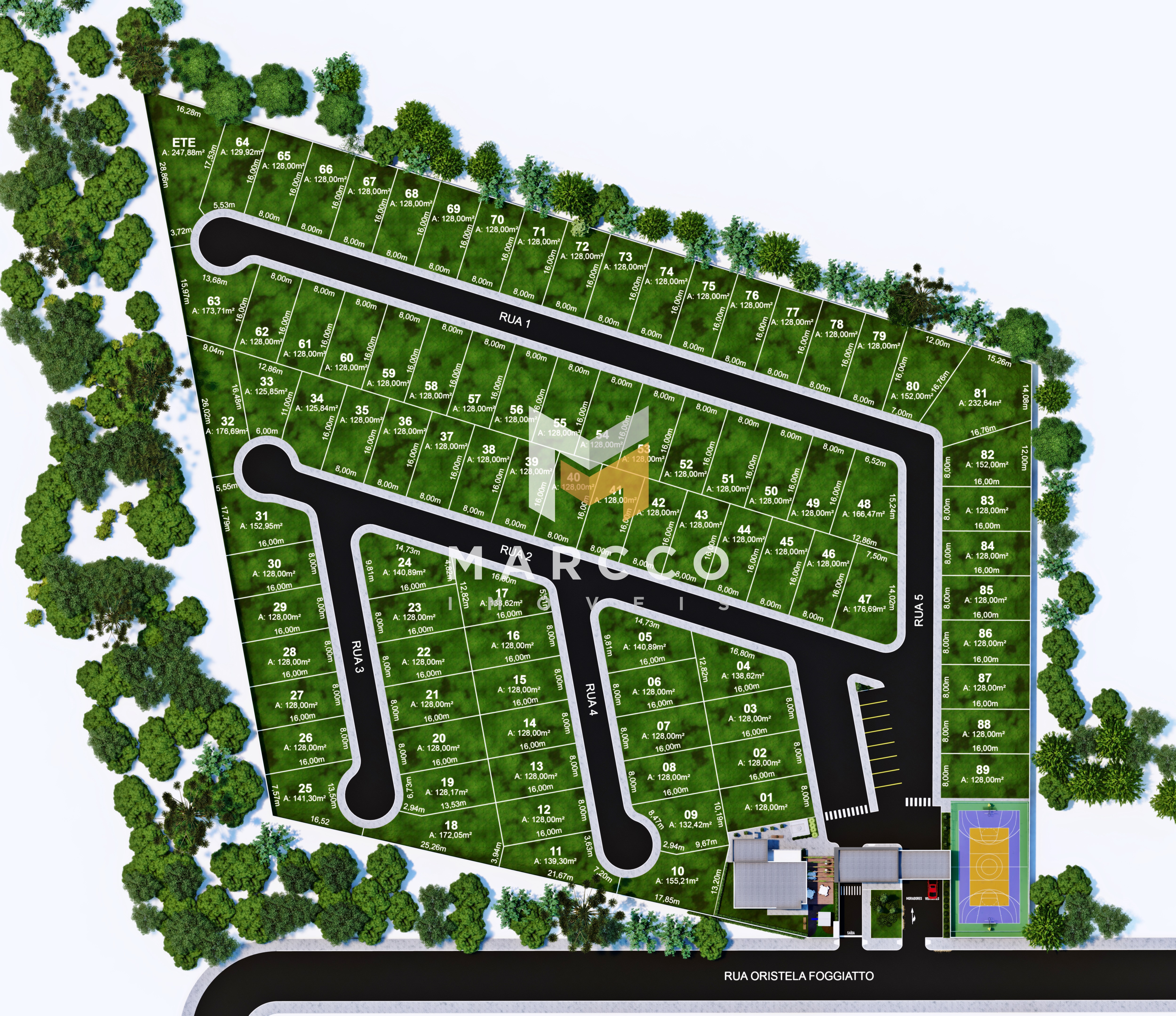 Condomínio com 89 lotes no total, padrão de 128 m² e com unidades especificas que variam de 125 a 232 m², infraestrutura subterrânea não aparente, rede elétrica hibrida e áreas comuns de lazer completas, decoradas e equipadas.